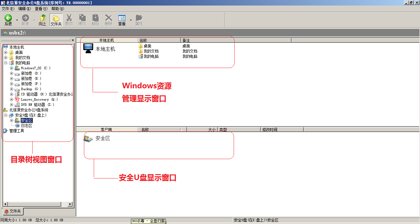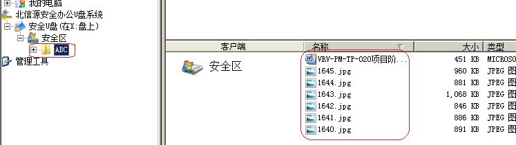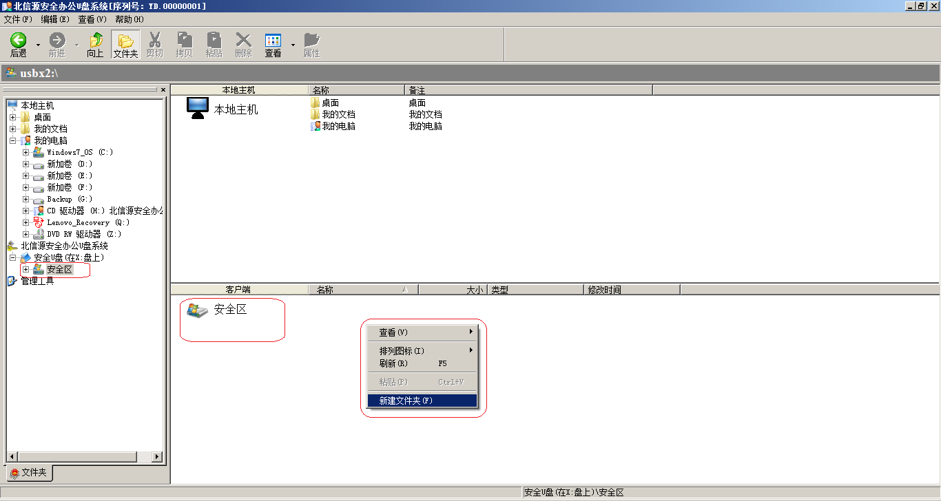- 在安全区内打开安全U盘资源管理器(首次使用要进行格式化),在左侧目录树视图中单击【安全区】,进入安全区进行操作管理。