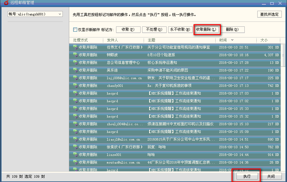 - 弹出框中选中其中一封邮件后按Ctrl+A全选,依次点击“收取删除”---“执行”