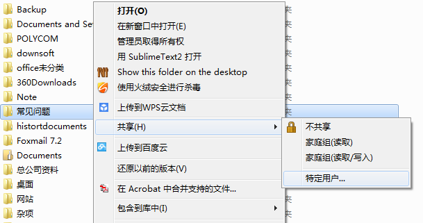 选中要共享的文件夹,点击右键,依次选择共享,特定用户