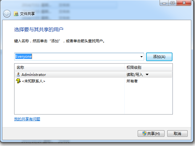在弹出的窗口输入Everyone,依次点击添加,共享